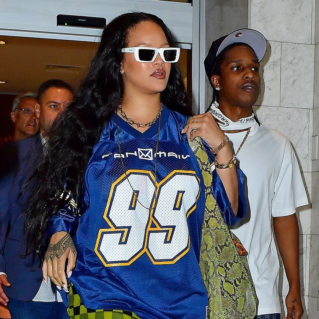The couple—who welcomed their first child together in May—looked more fashionable than ever as they stepped out in New York City on Aug. 23. In photographs from the parents’ night-out, Rih wore a navy blue sports jersey and checkered pants along with a snakeskin bag and white sunglasses. A$AP complemented the “Diamonds” singer’s outfit by wearing a plain white T-shirt, blue Gucci slacks, and chunky sneakers. He topped off his fit with a black New York Yankees hat.