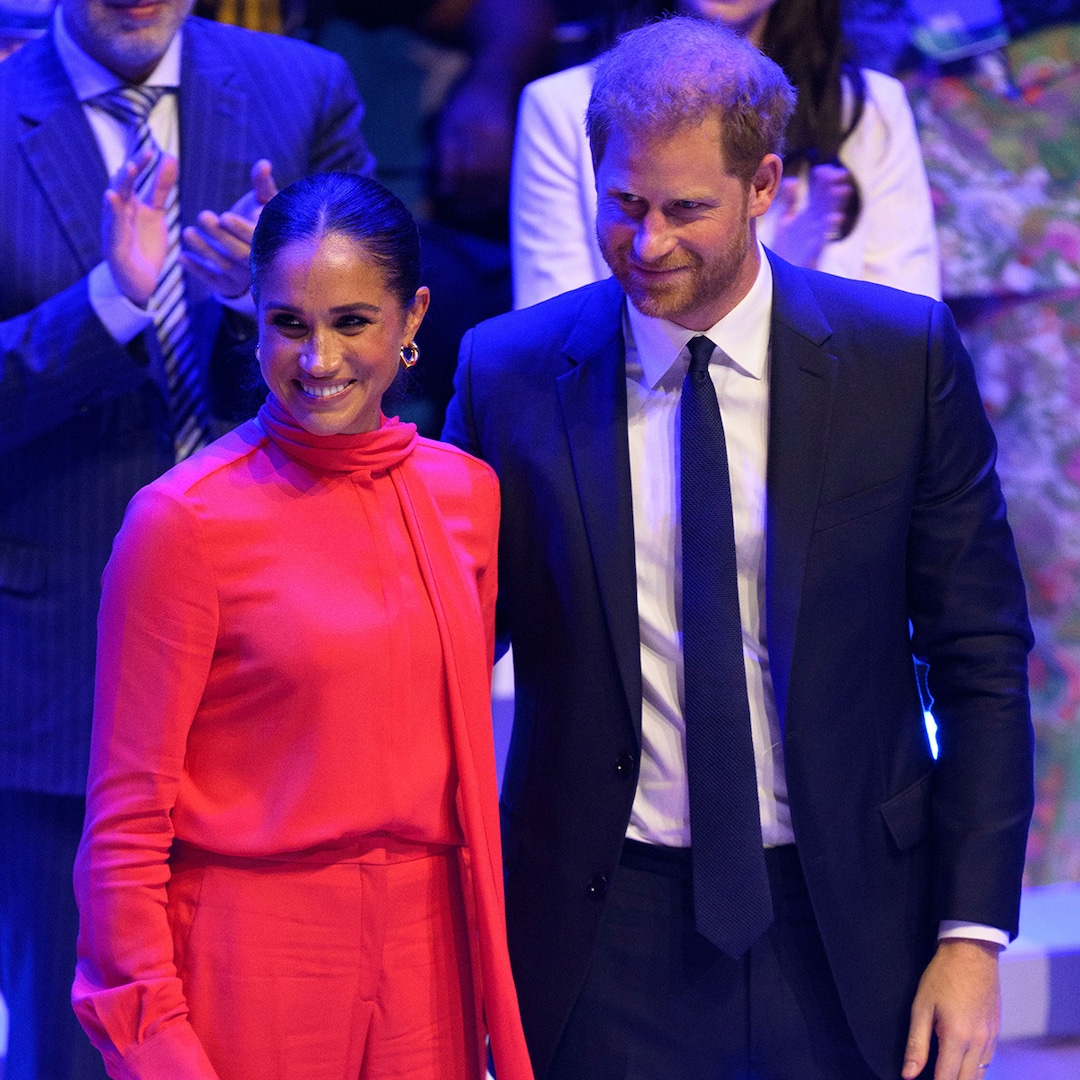 The Duke and Duchess of Sussex returned to the United Kingdom on Sept. 5, stepping out at the 2022 One Young World Summit in Manchester, England. For the occasion, Harry donned a dark blue suit with a white shirt and black tie, while Meghan was clad in a crimson red blouse and matching trousers from sustainable brand Another Tomorrow.